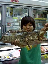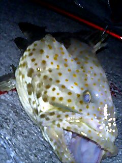 7月25日の夜から打ち込みをしに宜名真漁港へ行ってきました。 この日、満潮は夜中の03:26中潮。メンバーは面倒見のいいベテラン釣り師砂辺さん、 サンノリー北谷店スタッフもりお〜とその友達ともたぁと私の4名。足場の悪い石ころ道を 歩くこと約15分、先端到着。その時点で結構くたくた…… 打ち込み用の竿をだして、ゆっくりしていると砂辺さんの真っ赤なノリックスGTRにヒットが! しかし引かない!? 「あい、ウツボだはず…糸切ろうかな」と砂辺さん。「練習も兼ねてアサミに巻かせば?」と、 もりお〜が言ってくれたので、自分の竿が曲がった時の練習だ♪と歯を食いしばって糸を巻いて いるとタモに入って出てきたのはミーバイでした♪ 誰が釣ったか微妙な感じですが、私の名前で投稿しました(汗;) (帰ってサンノリーで測ったら53cm 2kgでした) |