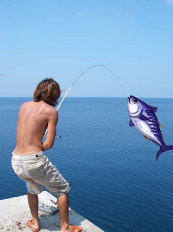 あと少しで糸が全部でてしまう〜っとドキドキしてたら、また静けさが…止まった? しばらくじっとしてると、糸が巻ける状態に♪のびきった糸を気にしながら慎重にまいていると、 動かなくなってしまった! カツオが死んでどこかにかかってしまったようでピクリともしない…その後も何度かトライするが 全然動かない…結局、思いっきり引っ張って糸が切れておしまい… |